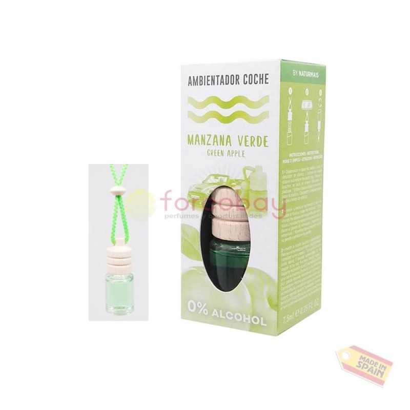 Lufterfrischer für mäßig langlebiges Auto, NATURMAIS GRÜNER APFEL. Glasflasche mit 7,5 ml und Diffusorkappe aus Holz mit Aufhängeöse.